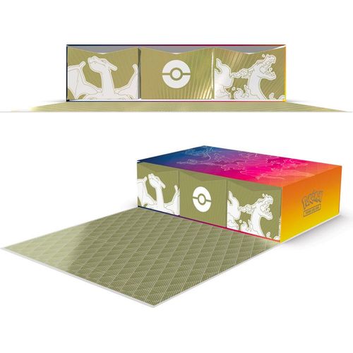 Celebrate the Sword & Shield Series and the era of Pokémon V, Pokémon VMAX, and Pokémon VSTAR with a hotshot who knows how to put all that power to good use! Charizard turns up the heat as a trio of promo cards with an etched foil treatment, and its Gigantamax form shows off blazing style on a playmat, metal coin, and set of card sleeves. Metal dice and condition markers round out this ultimate set of gameplay accessories. And as you open the huge stack of booster packs inside this box, take a journey through the Sword & Shield Series with an original booklet full of images and stats!