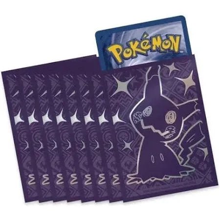 The Pokémon TCG: Scarlet & Violet Paldean Fates Elite Trainer Box 65 pack card sleeves featuring artwork of Shiny Mimikyu. They are designed to protect and display your cards with durable materials.